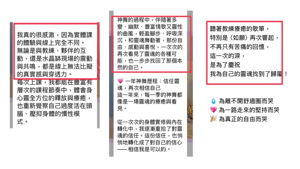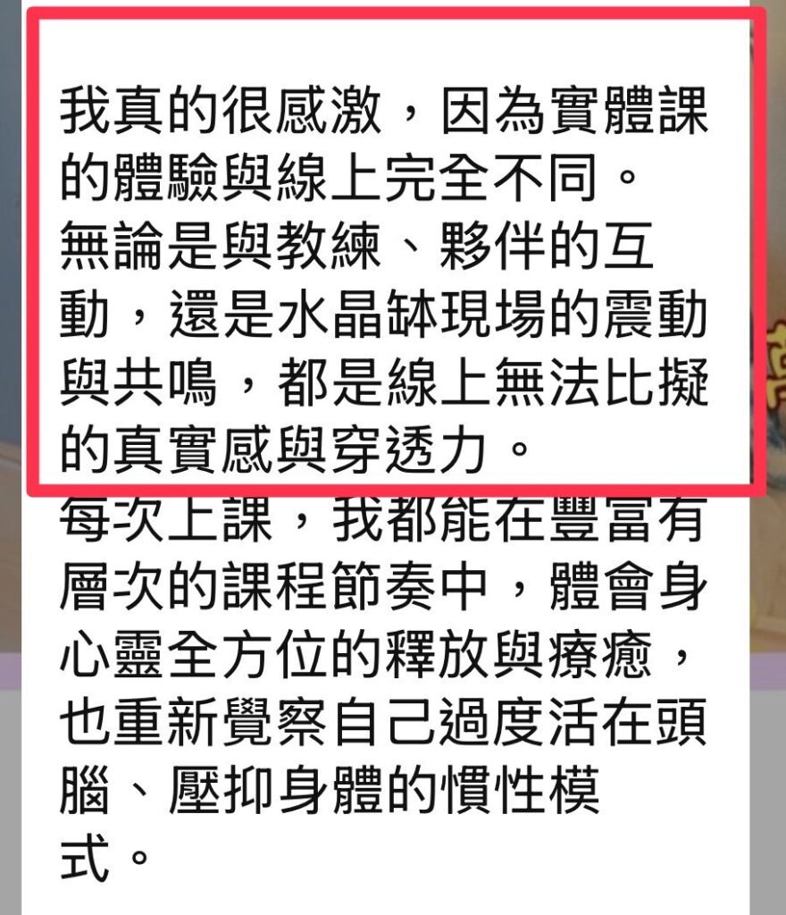 ⭐️全領域能量專精:阿卡西紀錄、聲音療癒、身心覺察、本心流瑜伽 ⭐️靈魂與落地並重:能從靈魂藍圖找到卡點,同時引導具體的行動方向 ⭐️場域共振力強:學員常形容課堂像「被托住」,自然產生轉化的動力 ⭐️轉化速度快:不是靠長期依賴,而是幫你喚醒自己最核心的力量 很多人走進課堂時帶著混亂與壓力,走出去時,心中多了一個清晰的方向感——而那個方向,就是與本心一致的道路