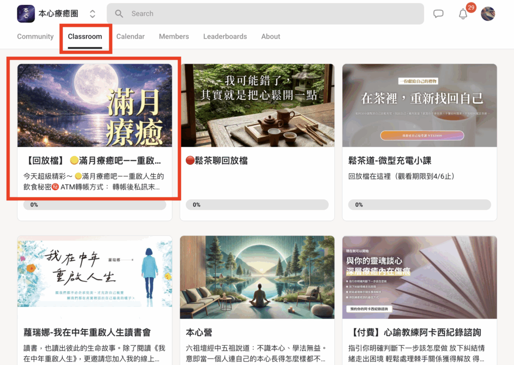 P.S 如果您已經在本心療癒圈skool社群,請直接開啟Skool APP,按照下圖找到該回放檔,